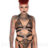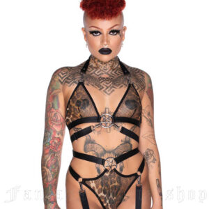 Wrapped up in a dream-like state with no desire to wake up; ‘Hell Kitty’ fishnet bralette; conjured using a soft-touch stretch fabric that fits to perfection. Complete with pentagram hardware, seductive accent straps to wrap around your waist, and adjustable straps; you’ll feel like the powerful woman you are wearing this statement piece.
